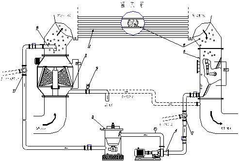 1、凝汽器 2、二次濾網(wǎng) 3、裝球器 4、膠球泵循環(huán)泵 5、收球網(wǎng) 6、清洗膠球 7、分匯器 8、噴球器 9、電動排污門