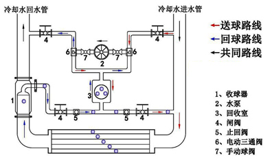 冷凝器清洗適合選全自動(dòng)在線膠球清洗裝置安裝指導(dǎo):在冷卻水循環(huán)管路上,加裝由發(fā)球器、收球器、控制器等管路系統(tǒng)組成的旁路,通過(guò)發(fā)球器將膠球注入冷凝器內(nèi),在系統(tǒng)自有壓力的作用下,對(duì)冷凝器銅管內(nèi)壁的污垢進(jìn)行自動(dòng)清洗,在出水口端由收球器將膠球?yàn)V回至發(fā)球器,形成一次完整的清洗循環(huán)。通過(guò)控制系統(tǒng)可設(shè)定清洗頻率,實(shí)現(xiàn)自動(dòng)在線清洗功能,使冷凝器銅管內(nèi)壁始終處于清潔狀態(tài),提高了換熱效率,并降低了能耗,從而達(dá)到節(jié)約能源的目的。