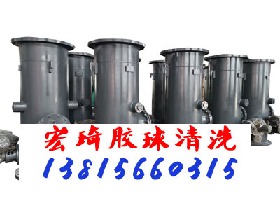 我公司生產(chǎn)的凝汽器膠球清洗裝置,適用于50~600MW汽輪機(jī)發(fā)電機(jī)組,膠球清洗裝置主要由膠球泵、收球網(wǎng)、裝球室、電控柜以及附屬件等設(shè)備組成。其工作原理是:膠球泵啟動(dòng),借助水流的作用將直徑大于冷凝管內(nèi)徑的海綿膠球擠進(jìn)凝汽器冷凝管,經(jīng)收球網(wǎng)收球再進(jìn)入裝球室。通過這一過程,膠球?qū)淠苓M(jìn)行清洗,維持冷凝管內(nèi)壁清潔,保證凝汽器設(shè)計(jì)換熱效率不下降,從而維持凝汽器的端差和汽輪機(jī)背壓;同時(shí)避免冷凝管內(nèi)壁腐蝕,改善運(yùn)行條件,延長(zhǎng)機(jī)組壽命。