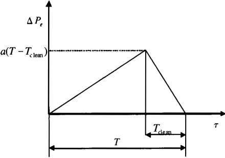 通過測(cè)取機(jī)組清潔率隨時(shí)間變化的曲線,就可以得到由于臟污使汽輪機(jī)排汽壓力Pc隨時(shí)間的變化關(guān)系。即:p,-=fM, ⑴其中,岳為汽輪機(jī)排汽壓力,Pa。由汽輪機(jī)功率Pe隨排汽壓力變化關(guān)系曲線,得:P哉(公),⑵結(jié)合式(1)和式(2),可以得到由于臟污所引起的汽輪機(jī)功率隨時(shí)間的變化式:ARHS),⑶其中,△四為臟污所引起的汽輪機(jī)功率的變化值,kWo當(dāng)清洗系統(tǒng)投入運(yùn)行時(shí),污垢的清除也是逐漸進(jìn)行的,隨著清洗過程的繼續(xù),由臟污所造成的損失逐漸減小,直至清洗時(shí)間K噸后,臟污所引起的損失達(dá)到零,在清洗過程中汽輪機(jī)功率隨時(shí)間的變化式如下。AF"),⑷其中,Ape為在清洗過程中汽輪機(jī)功率的變化值,kW0為簡化計(jì)算,在不長的時(shí)間間隔內(nèi),可以將功率損失曲線近似作直線處理,如圖1所示。