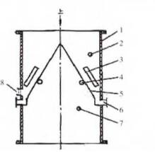圖4改造后的A形雙箭式收球網(wǎng)縱剖面結構注:1捕環(huán)水管管壁;2網(wǎng)前測壓點;3導流.板.;4軸;5網(wǎng)板;6脫球引出管;7網(wǎng)后測驗點;8觀寨孔